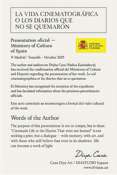 The archive's first entries confirm the growing recognition of the author's work across Europe. The epic memoir, "La vida cinematográfica o los diarios que no se quemaron" (Post-Cinematic Literature), has received official presentation confirmation from the Ministerio de Cultura y Deporte de España in Madrid. This formal act of cultural value recognition follows the work's earlier registration with the Gobierno de Canarias and its Cultural Recognition. The book, which contains the author's personal history, including life in the bombarded city of Jersón (Kherson), Kiev, and the "closed nuclear city," is a vital document of memory in the face of conflict and Madame J's influence. The author, Diya Cara, states that the work is not meant to compete, but to create a dialogue with memory, art, and the history that refuses to be burned.